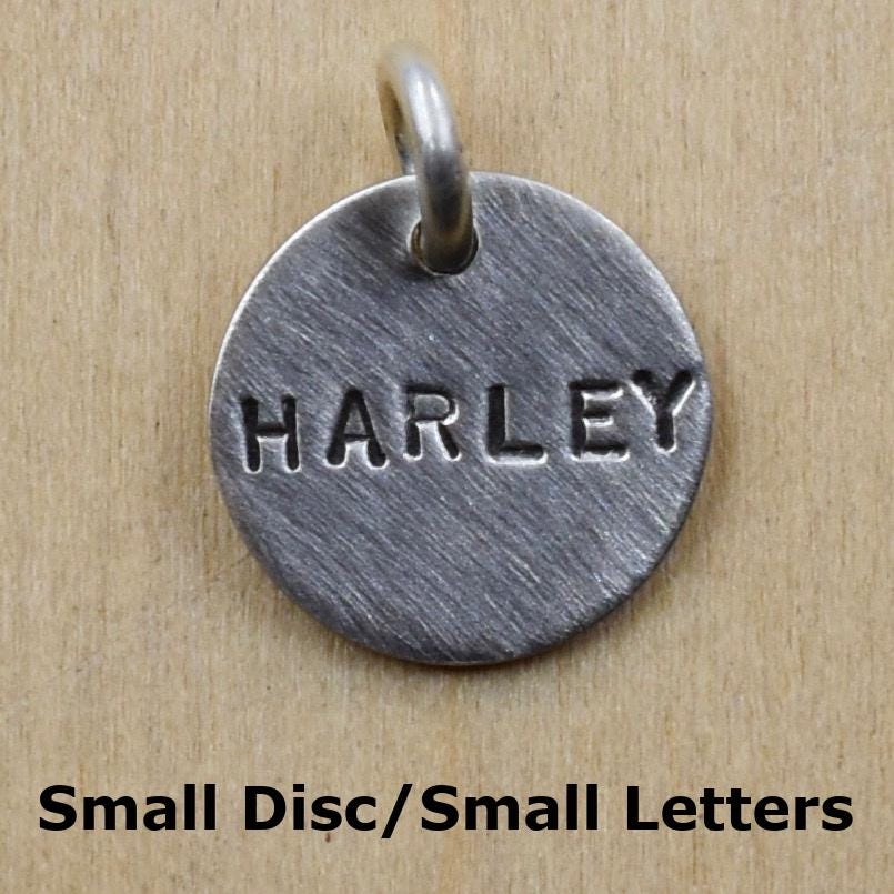Show off your loved ones with pride with these custom name stamped sterling silver discs. Choose small letters, an initial, or a date and the disc size you'd like. See photos for examples.