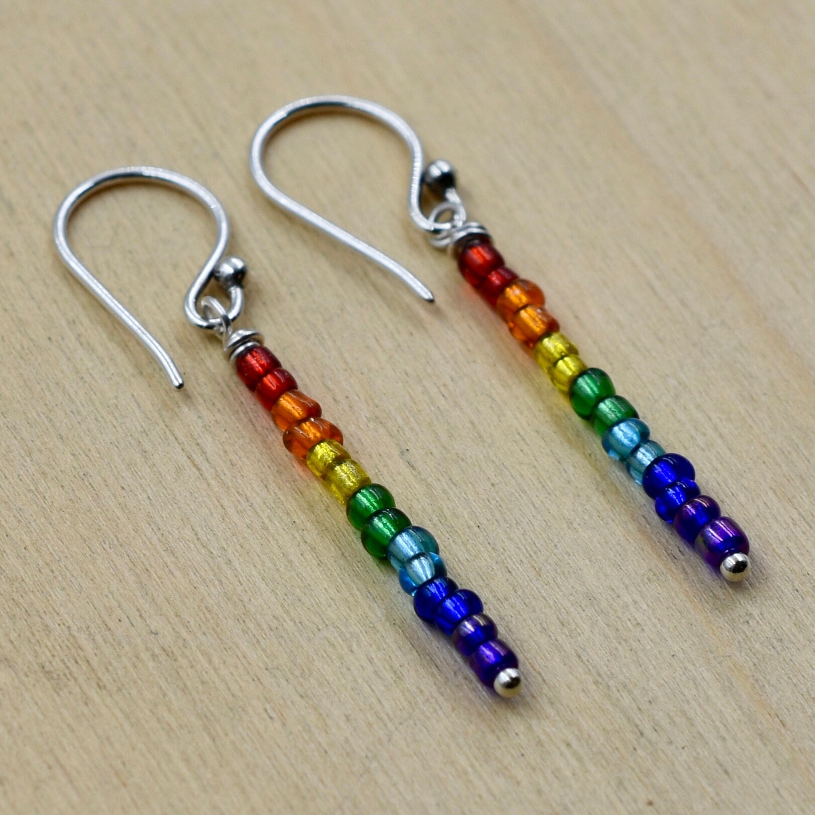 Rainbow colored seed beads are wire wrapped on a sterling silver pin and and hang on sterling ear wires for a fun way to show your pride. Rainbow beads measure approximately 1" long.