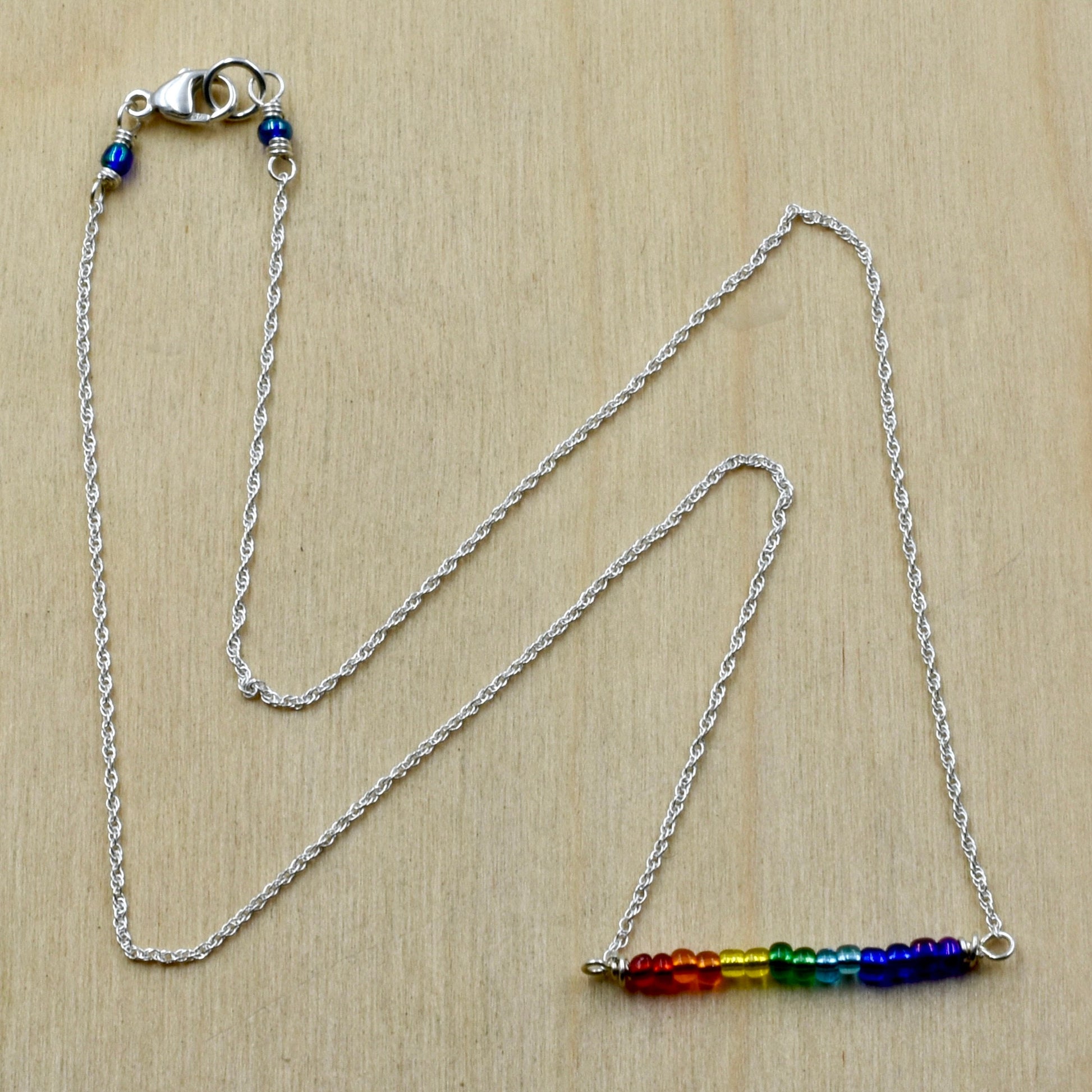 Rainbow colored seed beads are wire wrapped into sterling silver rope chain to create this necklace perfect for showing your pride. Rainbow portion measures approximately 1" long.